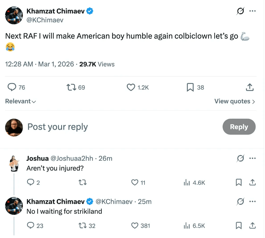 När det kommer till att försvara sin UFC-titel är det Sean Strickland som verkar stå näst på tur enligt Chiaev. När han fick frågan om han var skadad svarade mästaren nämligen att han väntar på Strickland.